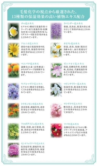 水、プロパンジオール、γ-ドコサラクトン、(ジヒドロキシメチルシリルプロオキシ)ヒドロキシプロピル加水分解コムギタンパク、 加水分解ケラチン、白金、シスチン、ヒアルロン酸Na、ダイズステロール、クオタニウム-18、ベヘントリモニウムクロリド、 チャ花エキス、アルニカ花エキス、ベニバナ花エキス、ヤグルマギク花エキス、ラベンダー花エキス、カミツレ花エキス、 ゼニアオイ花エキス、トウキンセンカ花エキス、ユフボダイジュ花エキス、ツバキ花エキス、クエン酸Na、PCA-Na、乳酸Na、 アルギニン、アスパラギン酸、PCA、グリシン、アラニン、セリン、バリン、プロリン、トレオニン、トレオニン、イソロイシン、 ヒスチジン、フェニルアラニン、PG、BG、フェノキシエタノール、メチルパラベンエチルパラベン、プロピルパラベン