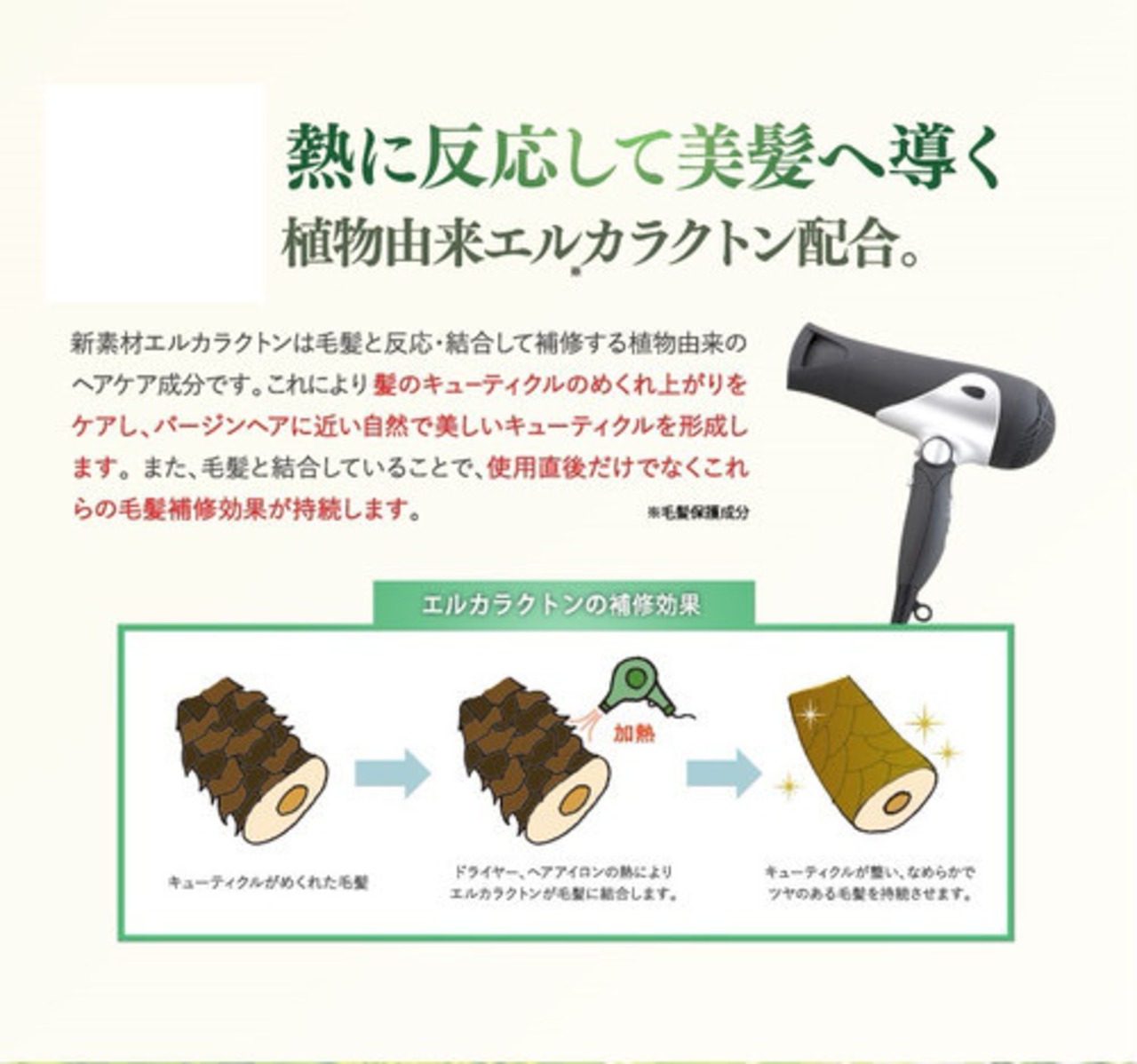 ドライヤーやアイロンを使うほどキューティクルの修復作用が高いエルカラクトン。カラー後の髪に残るダメージの素や肌への状態を健やかにする白金ナノコロイド。