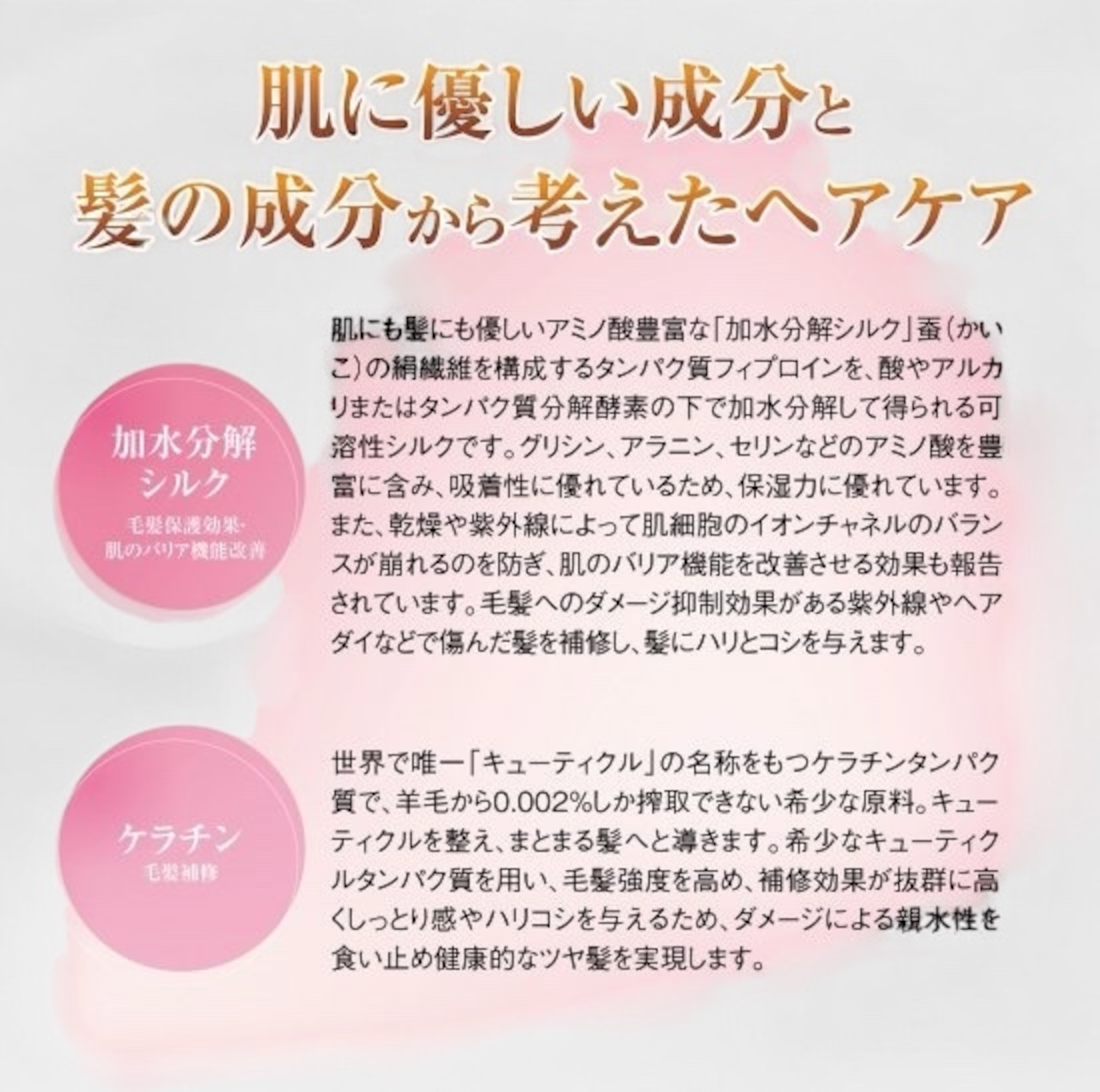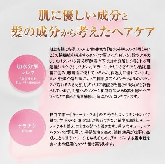 肌にも髪にも優しいアミノ酸豊富な『加水分解シルク』(かいこ)に絹繊維を構成するたんぱく質フィブロインを、酸やアルカリまたはタンパク質分解酵素の下で加水分解した得られる可溶性シルクです。グリシン・アラニン・セリンなどのアミノ酸を豊富に含み、吸着性に優れている為保湿力に優れています。 また乾燥や紫外線によって肌細胞のイオンチャネルのバランスが崩れるのを防ぎ、肌へのバリア機能を改善させる効果も報告されています。毛髪へのダメージ抑制効果がある紫外線やヘアダイなどで傷んだ髪を補修し髪にハリとコシを与える。 キューティクルケラチン(加水分解ウールキューティクルタンパク)