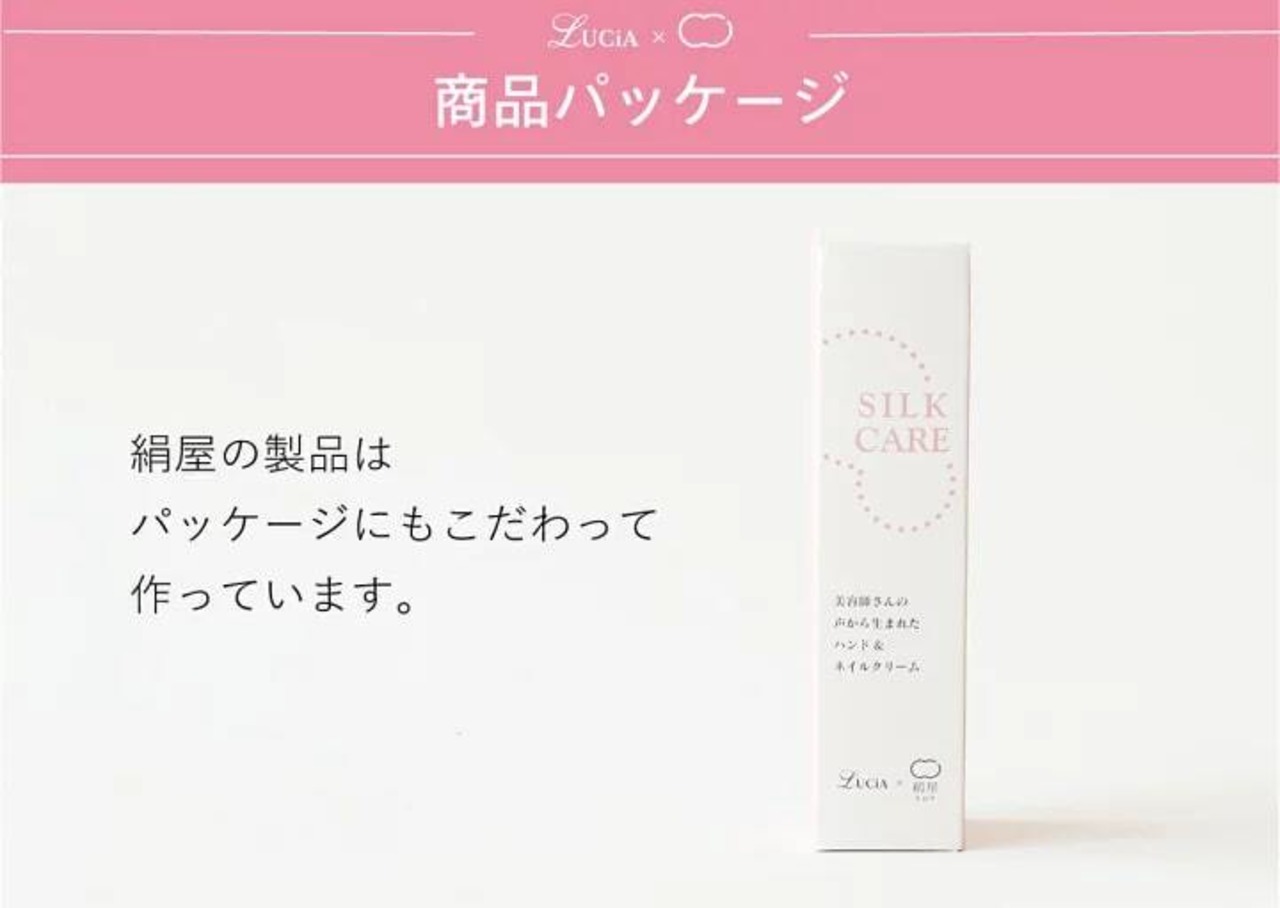 絹屋と美容サロン「ESPOIR」のコラボレーション商品で、指先のあかぎれやひび割れに有効な成分や肌バリア機能のある成分を贅沢に配合。